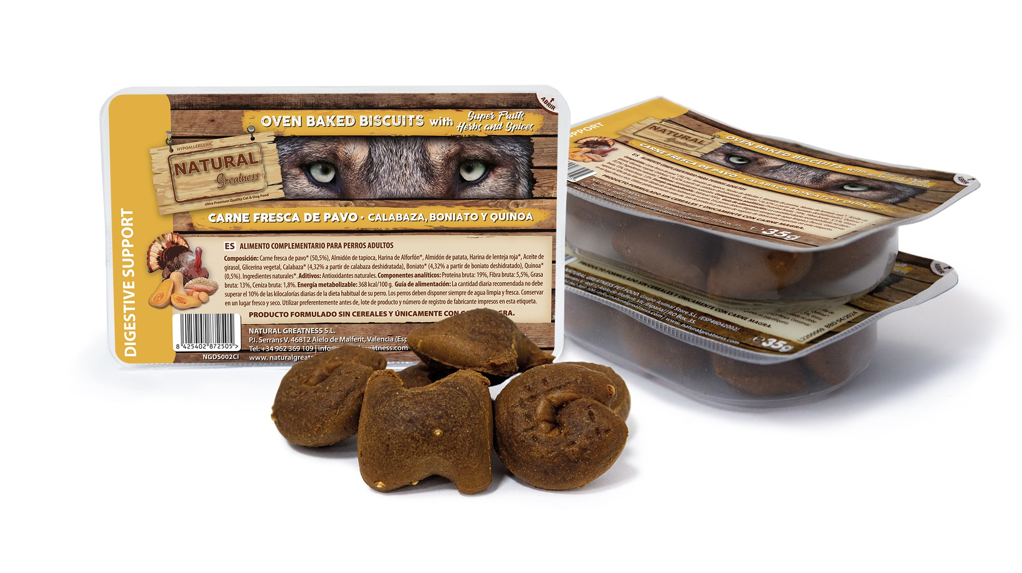 Galletas horneadas naturales, hipoalergénicas y sin cereales aptas para administrar como premio o recompensa a perros adultos. Además de la carne de pavo de alta calidad como principal ingrediente cárnico, este snack incorpora calabaza, boniato y quinoa, tres ingredientes que estimulan el buen funcionamiento del sistema digestivo del can.