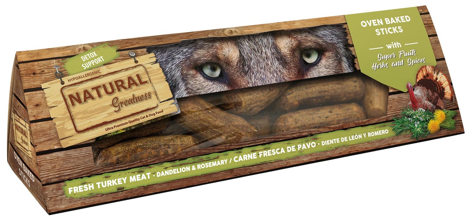 Barritas horneadas naturales, hipoalergénicas y sin cereales aptas para administrar como premio o recompensa a perros adultos. Además de la carne de pavo de alta calidad como principal ingrediente cárnico, este snack incorpora diente de león y romero, dos ingredientes con efectos depurativos para el organismo del perro.