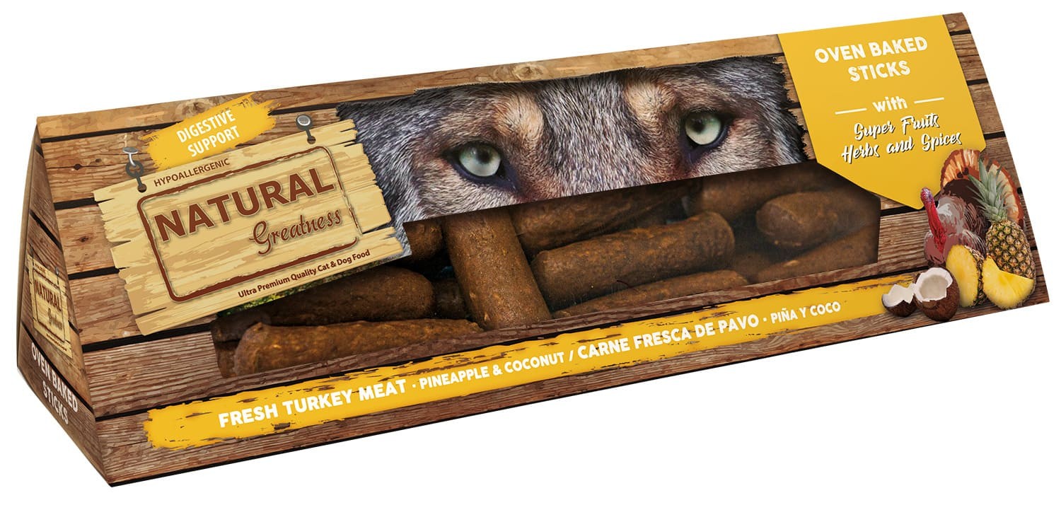 Barritas horneadas naturales, hipoalergénicas y sin cereales aptas para administrar como premio o recompensa a perros adultos. Además de la carne de pavo de alta calidad como principal ingrediente cárnico, este snack incorpora piña y coco, dos frutas con propiedades diuréticas y antinflamatorias muy beneficiosas para el sistema digestivo del perro.