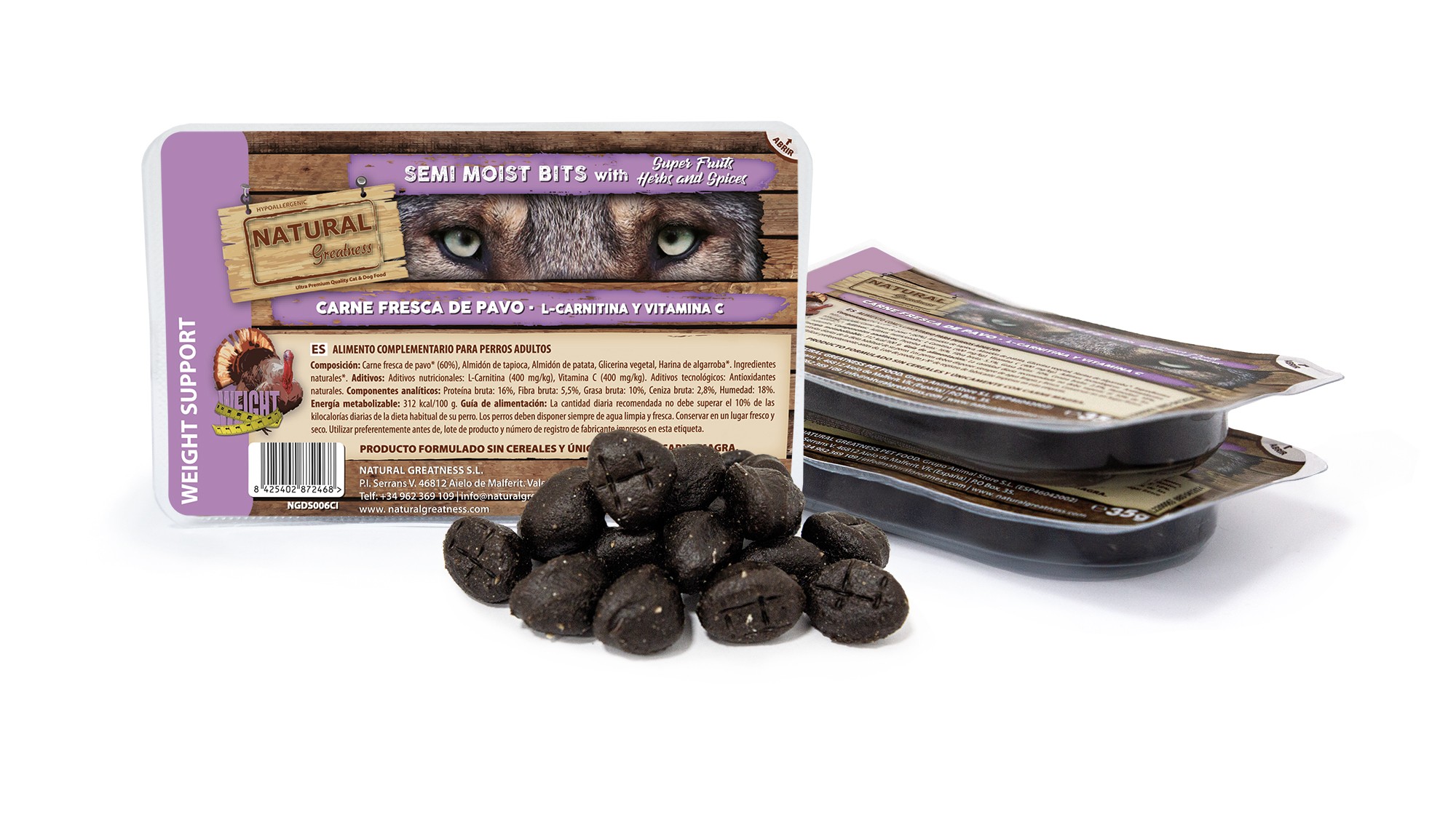 Bits semihúmedos naturales, hipoalergénicos y sin cereales aptos para administrar como premio o recompensa a perros adultos. Además de la carne de pavo de alta calidad como principal ingrediente cárnico, este snack incorpora L-carnitina y vitamina C, compuestos que ayudan a la pérdida y el control de peso del perro.